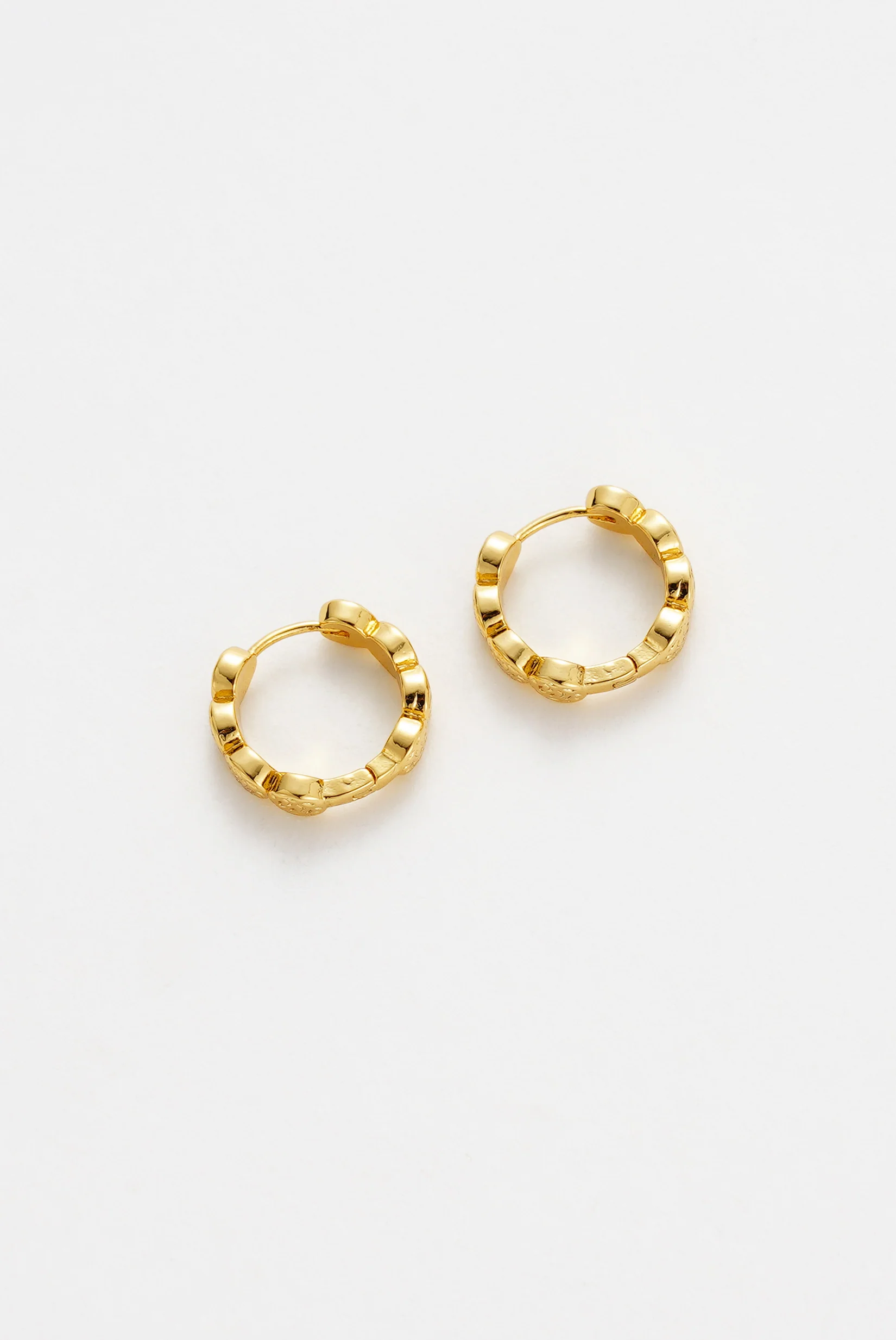 The Josie Huggie is a textured small hoop that brings subtle detail to a timeless silhouette. Featuring an intricate embossed design in a polished gold finish, this huggie is lightweight, versatile, and perfect for everyday wear. Style solo for understated elegance or stack with other hoops and studs for a layered ear.