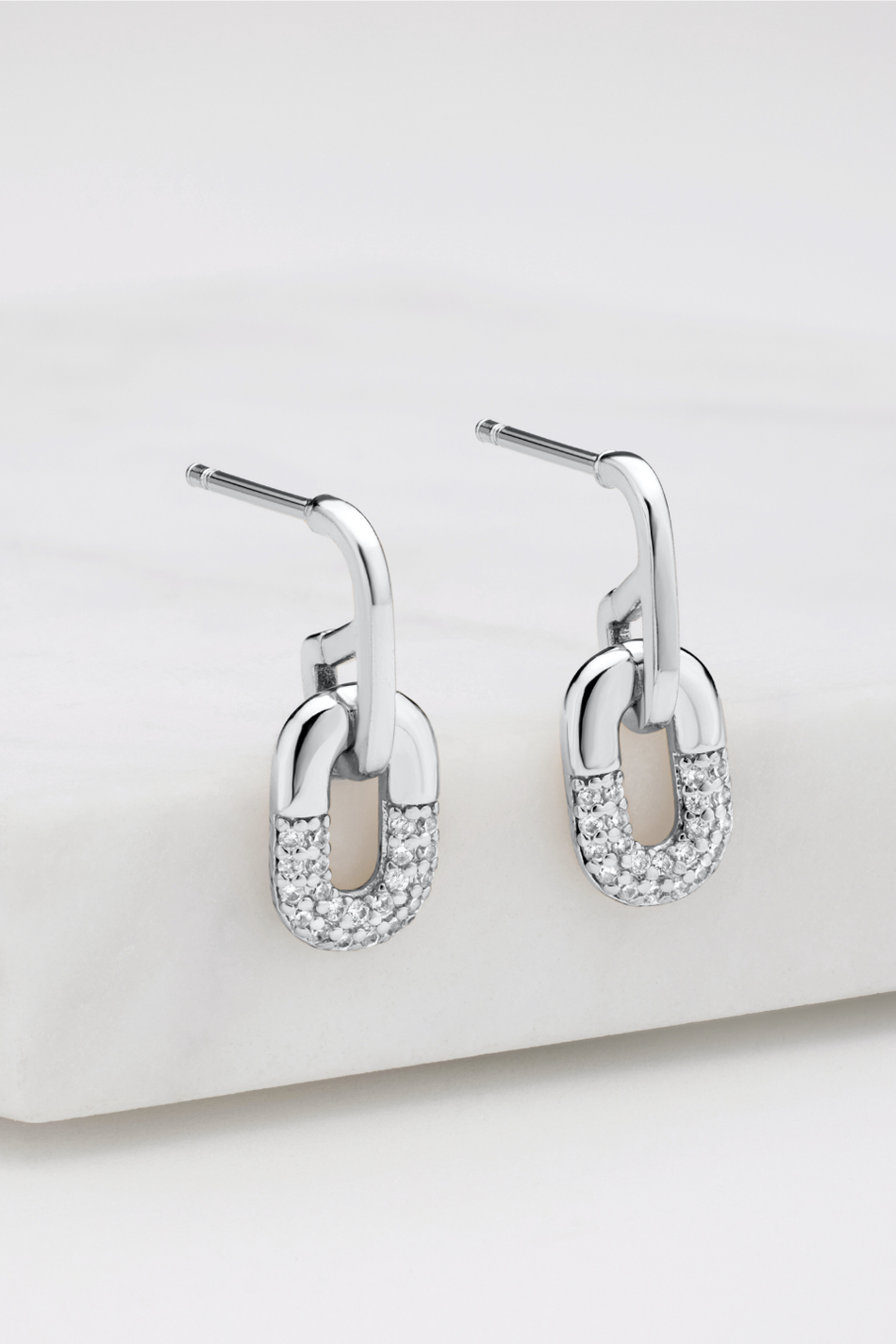 The Kaia Earrings in Silver are delicate hoop earrings featuring a sparkling crystal hanging charm for a touch of understated elegance. Their lightweight and refined design make them perfect for everyday wear or layering with other pieces for a more elevated look.