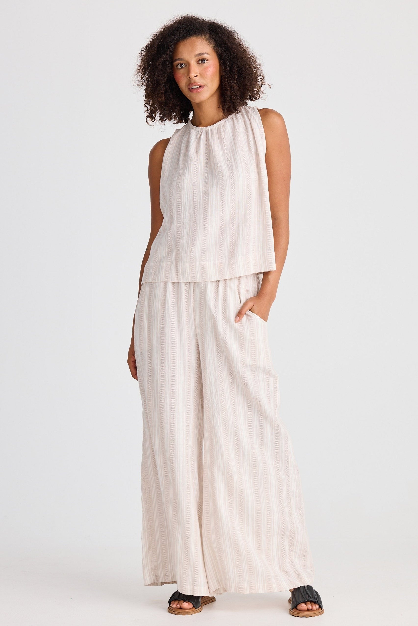 The Keo Top in Tuscan Stripe brings fun to your wardrobe with its sleeveless design and playful crew neckline, featuring delicate gathers that add a touch of charm. The elasticated back keyhole with a button closure offers an easy, comfortable fit, while the regular cut keeps things effortlessly stylish. Perfect for sunny days when you want to keep cool and look cool!