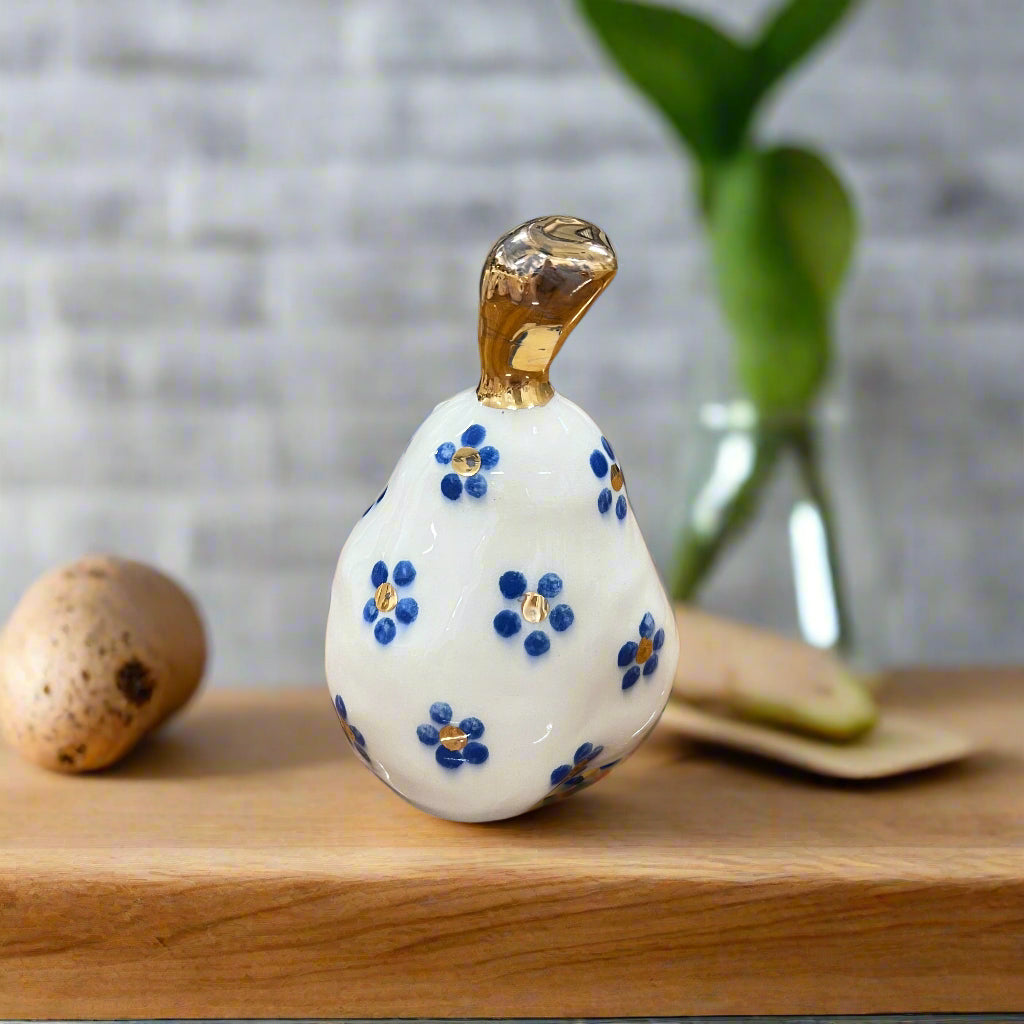 Add a touch of whimsy to your space with this Medium Ceramic Pear, featuring a charming green spot flower and a gleaming golden stalk. Each piece is hand-painted and uniquely shaped, making every pear one-of-a-kind. Standing about 13cm tall and 8.5cm wide, it’s the perfect playful accent to brighten any room.