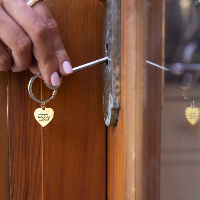 A handcrafted solid yellow brass disc on stainless steel keyring.