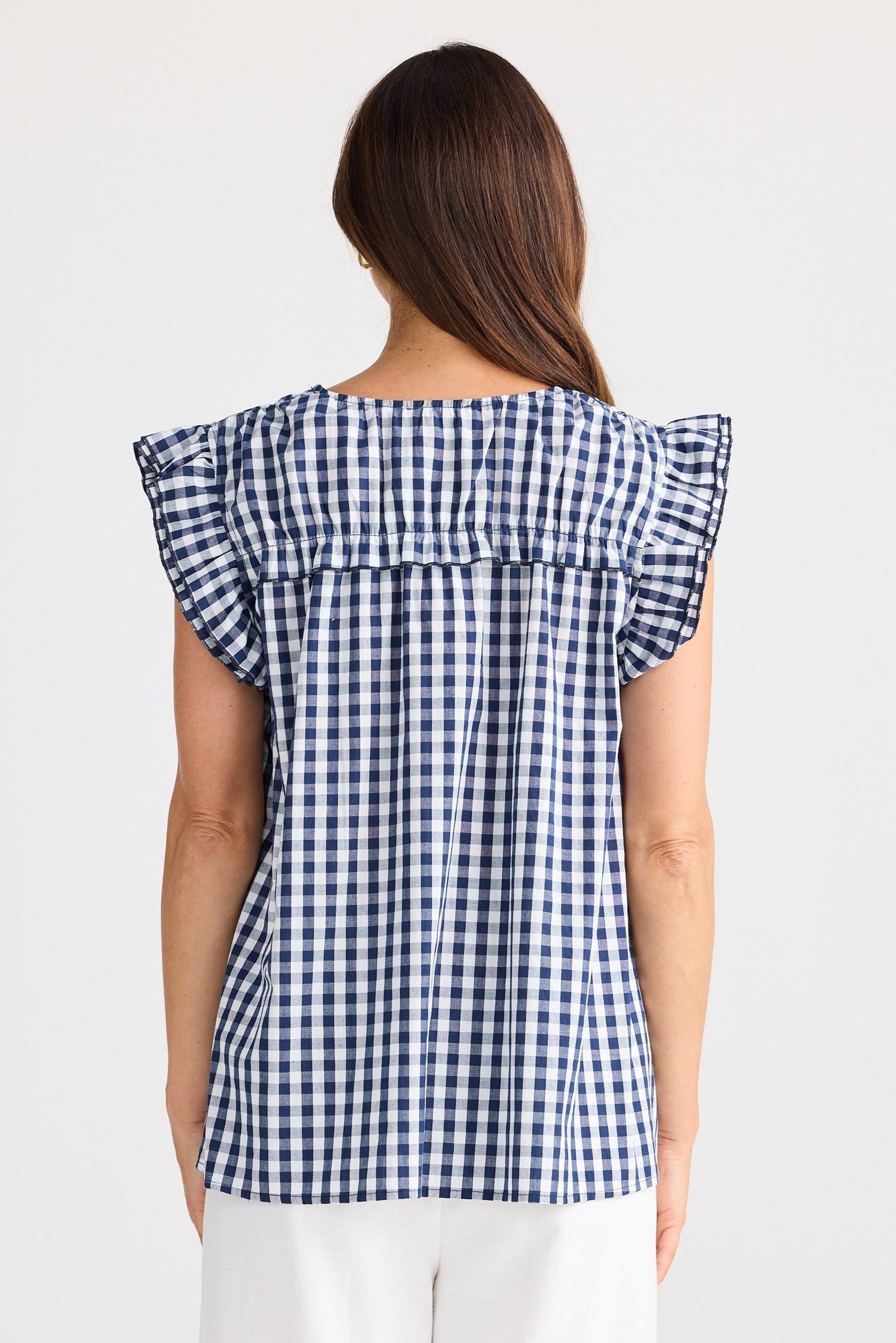 The Paz Top in Navy Gingham brings playful charm with its V-neckline and delicate gathered yoke framed by frill details. Short frill sleeves add a flirty touch, while the relaxed fit keeps it cool and comfy all day long. Made from 100% cotton, this top feels soft and breathable—perfect for sun-filled days and breezy adventures.