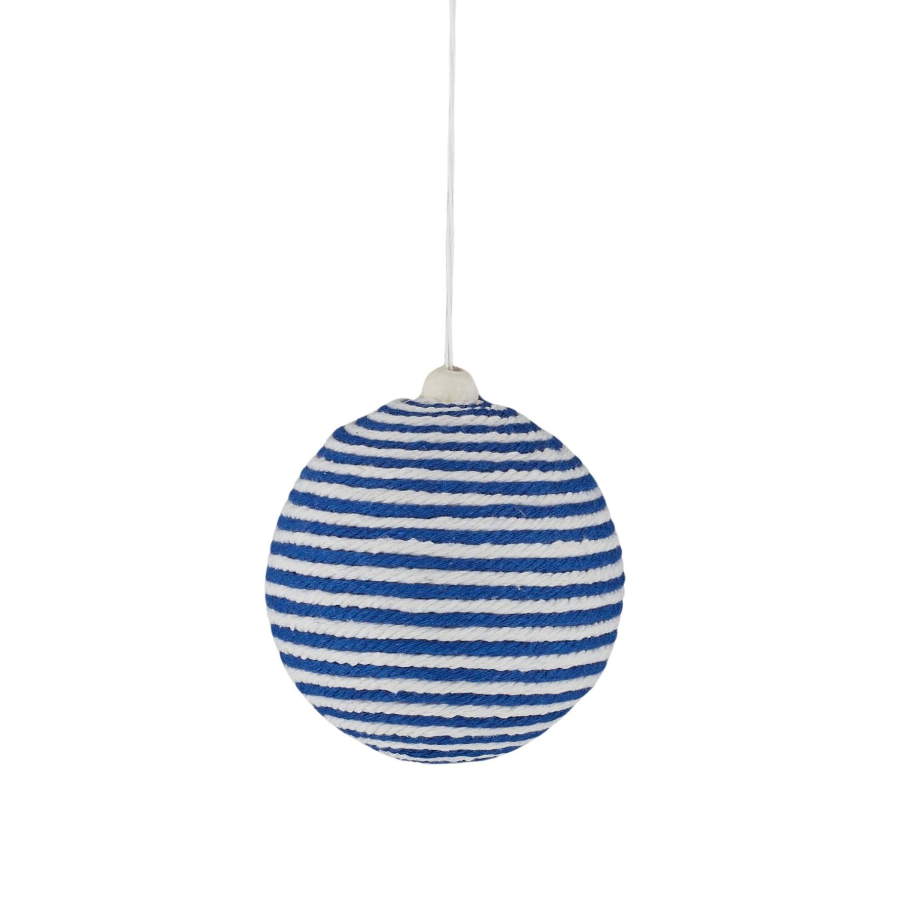 Enhance your holiday decor with the Navy Blue and White Poly/Jute Bauble. This stylish ornament features a unique blend of durable poly material and natural jute, creating a beautiful texture that adds depth to your Christmas tree. The striking navy blue and crisp white design brings a modern yet festive flair, making it a perfect accent for any holiday theme. Lightweight and easy to hang, this bauble is ideal for decorating trees, wreaths, or garlands. Available in three different sizes.