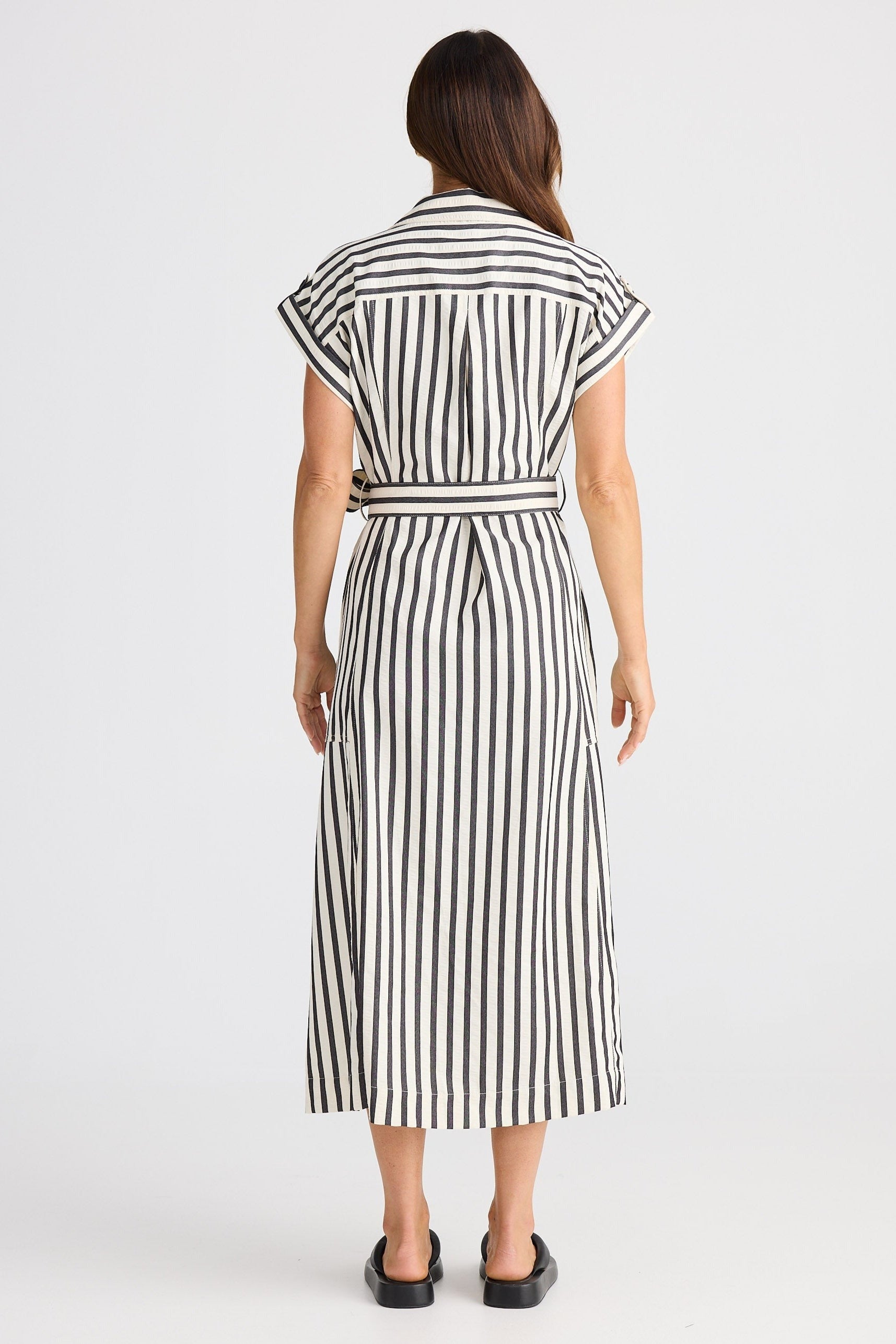 The Portia Dress in Black Stripe brings effortless charm with its open collar and button stand. Play with style and comfort thanks to cuffed sleeves with button tabs and handy side seam pockets. Its flattering midi length and matching waist tie let you define your look with a playful twist. Perfect for days when you want to feel both relaxed and radiant.