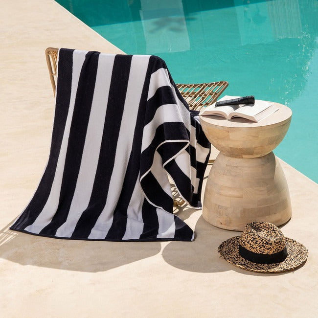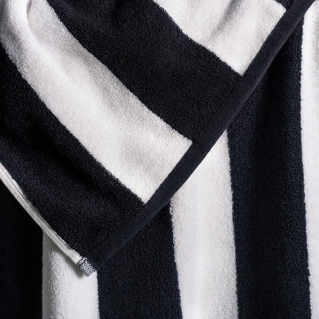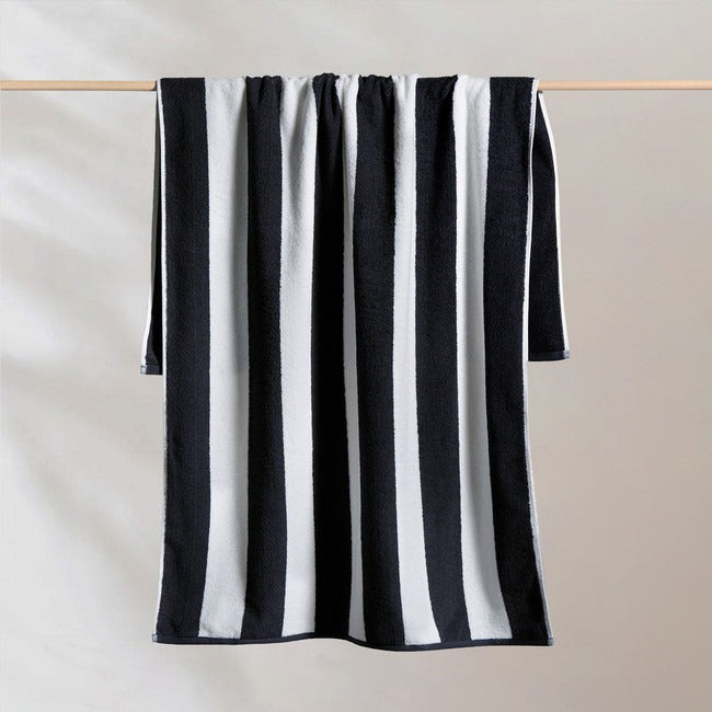The Striped Cabana Beach Towel in Black energises your beach day with a classic, bright white and black stripe. Whether you're soaking up the rays, enjoying a seaside picnic, or drying off after a refreshing swim, this towel combines functionality with fashion, making it a must-have accessory for your summer outings.